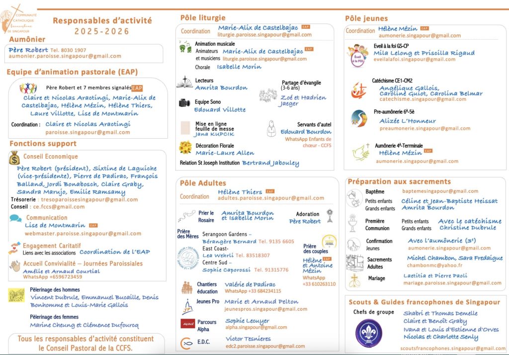 Vous avez envie de cheminer dans votre parcours de foi, de vous engager, vous venez d’arriver, vous avez envie d’élever vos enfants dans la foi catholique… Vous ne savez pas qui s’occupe de quoi, qui contacter, sur quelle adresse… Vous êtes un peu perdus.