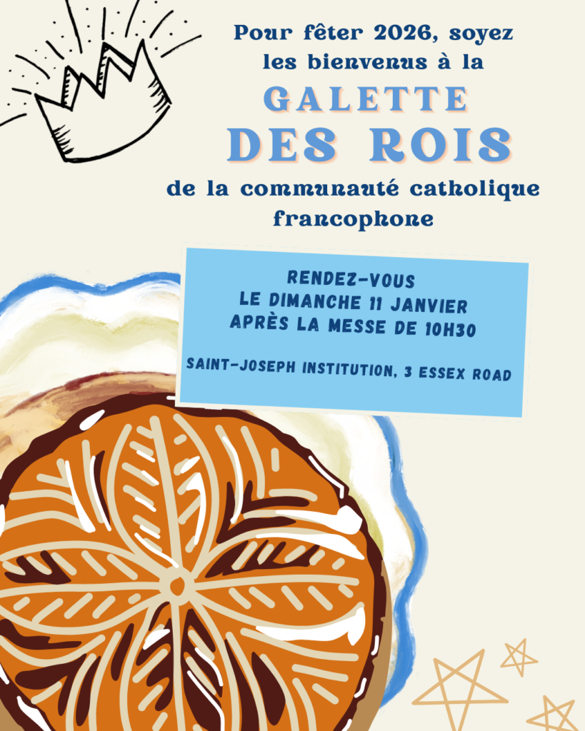 Nous vous donnons rendez-vous le samedi 11 janvier, après la messe, pour partager la galette des rois. Ce temps convivial est l’occasion de prolonger la célébration de l’Épiphanie, de rappeler la visite des Rois mages et de renforcer les liens fraternels au sein de notre communauté.